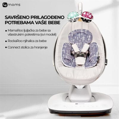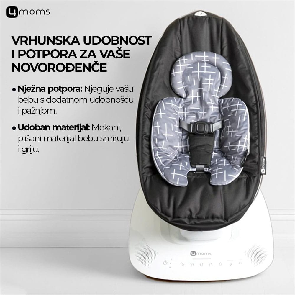 Jedna od velikih prednosti ovog 4moms umetka je lako odrzavanje. Podloga je periva u masini, sto znaci da roditelji mogu brzo i jednostavno ocuvati cistocu bez komplikovanog rucnog pranja. To je posebno korisno u svakodnevici sa bebom, kada su brzina, higijena i prakticnost od presudnog znacaja. Prema dostupnim informacijama, model je kompatibilan sa svim vaznijim 4moms lezaljkama, ukljucujuci mamaRoo, rockaRoo i bounceRoo, pa ga mozete koristiti kao svestran dodatak bez obzira koji 4moms model vec imate kod kuce.