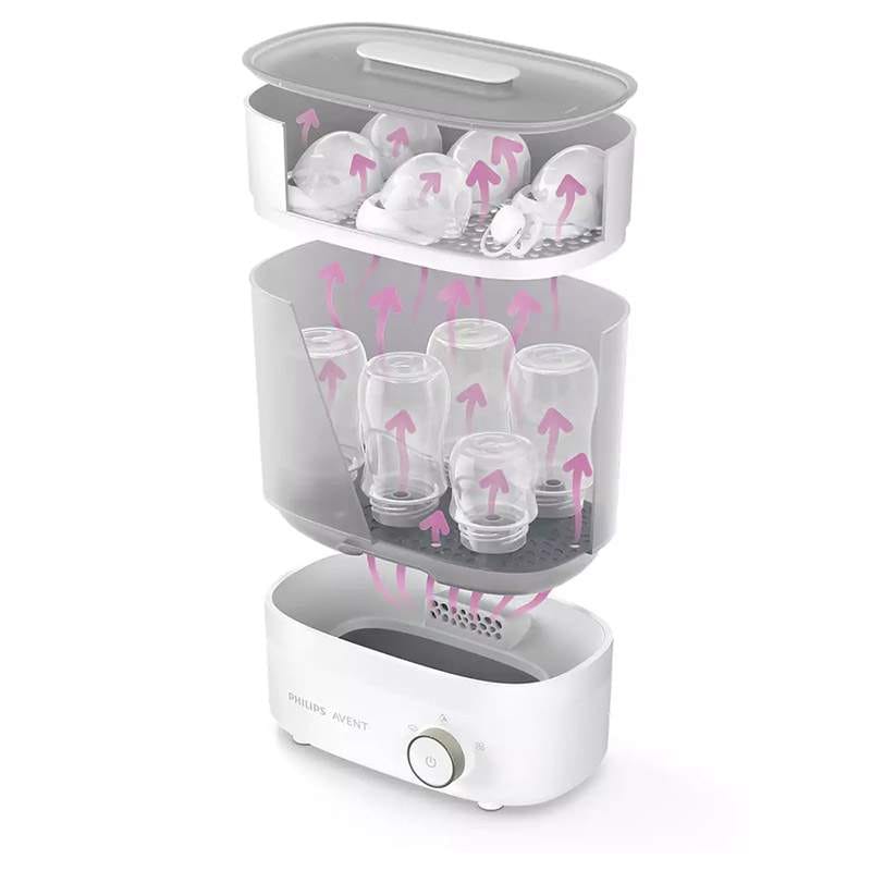 Ovaj uređaj pruža roditeljima praktično i sigurno rješenje za sterilizaciju i sušenje bočica i pribora nakon hranjenja. Štedi vrijeme i olakšava svakodnevne obaveze, osiguravajući maksimalnu higijenu i bezbrižnost. Zahvaljujući kompaktnom dizajnu, lako se uklapa u svaku kuhinju, a mogućnost sterilizacije većeg broja bočica istovremeno čini ga savršenim izborom za svakodnevnu upotrebu.