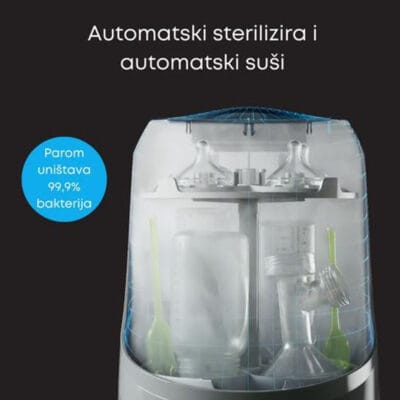 Ovaj praktičan uređaj može odjednom oprati i sterilisati do 4 flašice i dodatke, uz kompatibilnost sa većinom brendova. Nudi 6 režima rada – od potpunog ciklusa pranje-sterilizacija-sušenje, do opcija samo pranja, samo sušenja ili sterilizacije. Modularni dizajn sa odvojenim rezervoarima za čistu i prljavu vodu omogućava upotrebu bez priključivanja na vodovod.