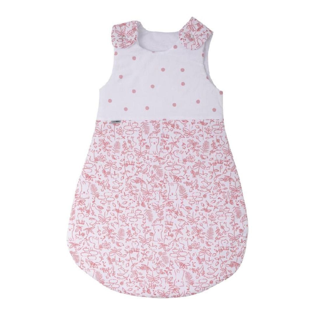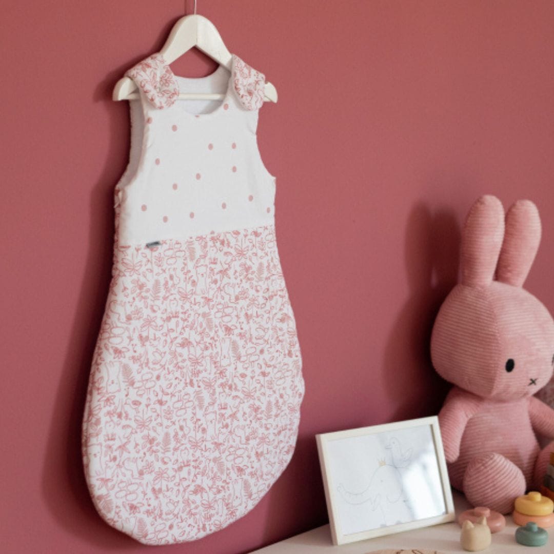Izrađena od 100 % pamuka, vreća je prozračna, mekana i nježna na dodir, savršena za osjetljivu bebinu kožu. Zahvaljujući skrivenom zatvaraču, oblačenje i presvlačenje su jednostavni, dok udobnost ostaje nepromijenjena. Dizajn s motivom veselih životinja u rozoj boji unosi radost i toplinu u svaku dječiju sobu.