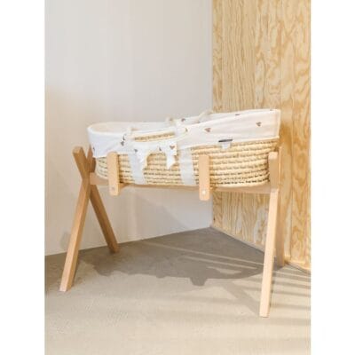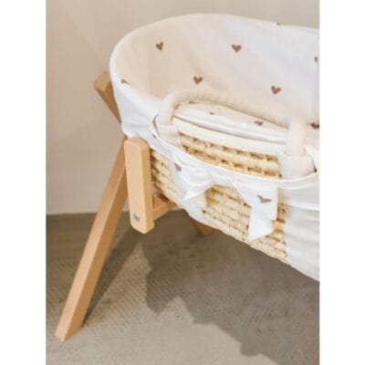 Childhome Moses korpa + madrac + navlaka Hearts pruža udobno i sigurno mjesto za spavanje novorođenčeta. Izrađena od prirodnih kukuruznih vlakana i upotpunjena mekanom pamučnom navlakom sa slatkim motivom srca, ova kolijevka unosi toplinu u svaki prostor.