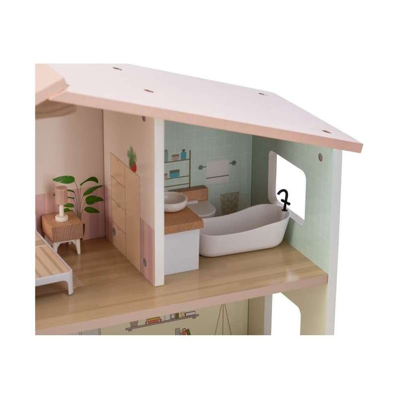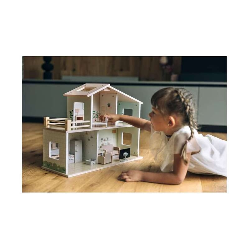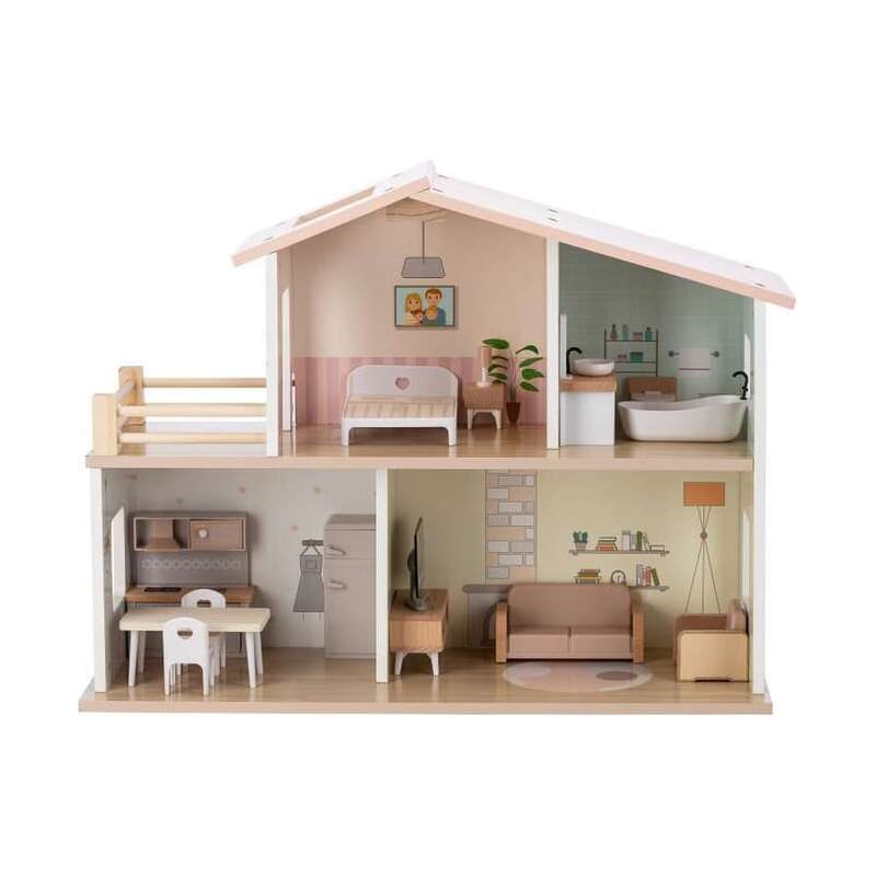 Kućica dolazi s kompletom minijaturnog namještaja – stolom, stolicama, kuhinjskim setom i krevetićem – koji omogućavaju djetetu da rekreira svakodnevne situacije i razvija kreativnost. Stabilna drvena konstrukcija s detaljima od plastike obojena je netoksičnim bojama i lakovima, sigurnim za djecu. Otvoreni dizajn pruža pristup sa svih strana, pa se više djece može igrati istovremeno, izrađujući svoje priče i avanture.