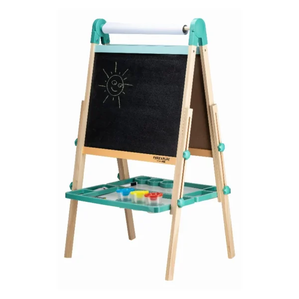 Free2Play drvena ploča za igru 2u1 (Duo Play) pruža djeci zabavan i edukativan način da izraze svoju kreativnost, razviju motoričke vještine i uče kroz igru. Ova višenamjenska ploča ima dvije različite površine koje omogućavaju različite vrste aktivnosti: jedna strana je klasična crna ploča za crtanje kredom, dok je druga strana bijela magnetna površina pogodna za pisanje markerom i igru s magnetnim slovima i brojevima.