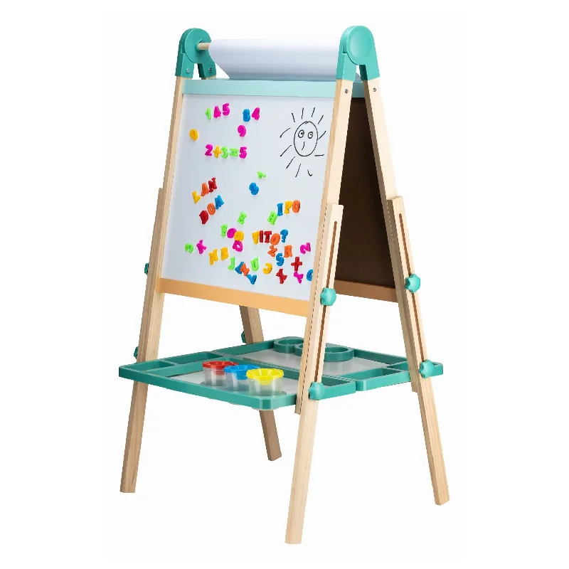 Uz tablu dolaze svi osnovni dodaci — krede, marker i set magnetnih slova i brojeva, tako da dijete može odmah započeti igru i učenje. Dvostrani dizajn omogućava istovremenu igru dvoje djece, dok drvena konstrukcija osigurava stabilnost i dugotrajnost. Dimenzije ploče (57 × 49 × 110 cm) čine je idealnom za upotrebu u dječjoj sobi, vrtiću ili igraonici.