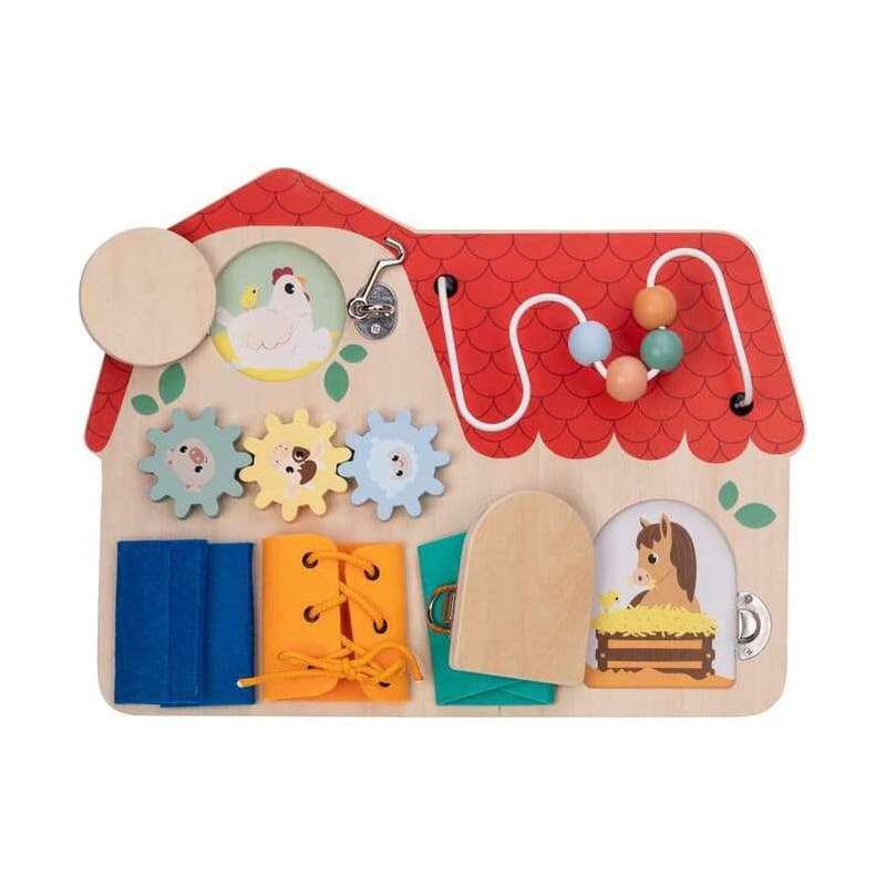 Sadrži više aktivnosti: otvaranje i zatvaranje prozorčića, pomjeranje dijelova, otkrivanje slika ili objekata iza vrata – potiče istraživački duh i koordinaciju pokreta.