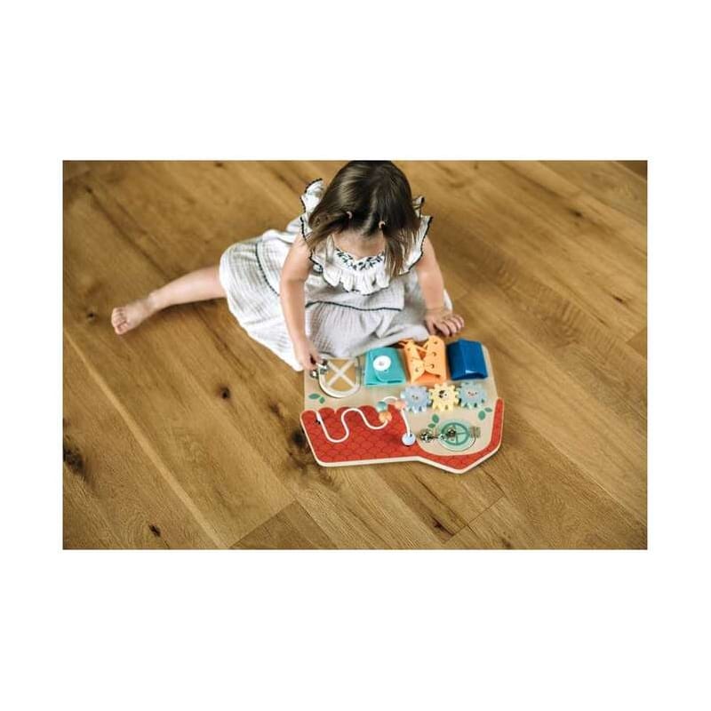 Ova drvena tabla aktivnosti spaja zabavu i učenje u jednom proizvodu. Idealna je za djecu koja tek otkrivaju svijet oko sebe, jer omogućava igru kroz koju se razvijaju važne vještine potrebne za kasniji razvoj. Zahvaljujući prirodnom dizajnu i neutralnim bojama, savršeno se uklapa u svaku dječju sobu i pogodna je i za vrtiće.
