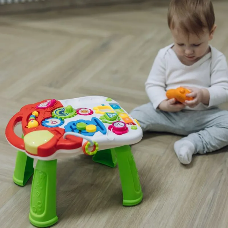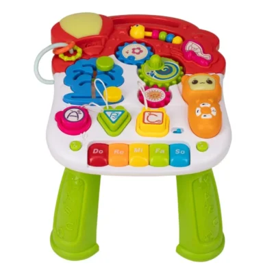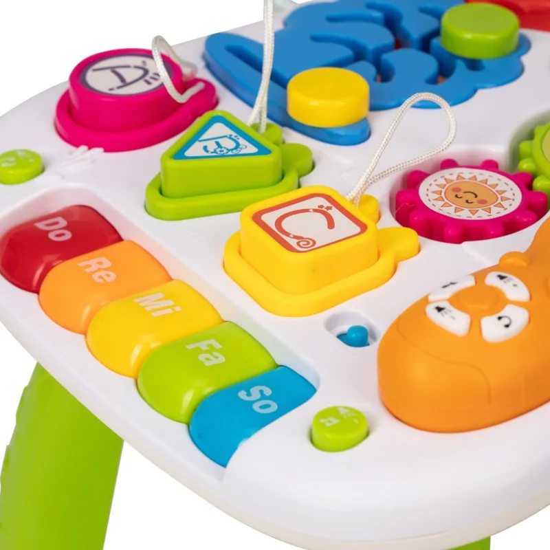 Prednji panel sadrži gumbe, loptice i interaktivne elemente koji stimulišu senzorne sposobnosti, koordinaciju oko-ruka i kreativnost.