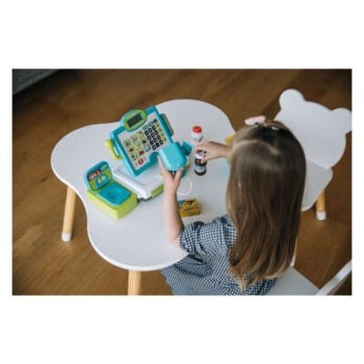 Blagajna proizvodi različite zvukove i omogućava djeci da se užive u ulogu prodavača ili kupca, učeći kroz zabavu o brojevima, novcu i svakodnevnim situacijama.