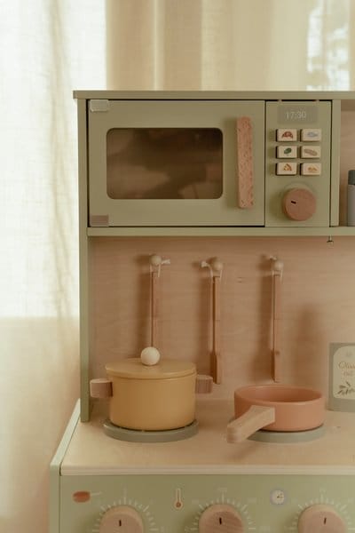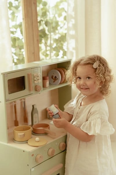 Mali kuhari mogu se baciti na posao u ovoj prekrasnoj drvenoj kuhinji za igru! Ispecite ukusan kolač u pećnici, pripremite svježe povrće na štednjaku ili ispržite jaje u tavi. Kuhinja je potpuno opremljena s dvije tave, priborom za kuhanje, tri tanjura i sudoperom za pranje posuđa i ruku. Također uključuje: bocu maslinovog ulja, set za sol i papar te ormarić za pohranu hrane. Mikrovalna pećnica ima prave gumbe s ilustracijama za dodatnu zabavu u igri. Što se danas kuha?