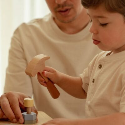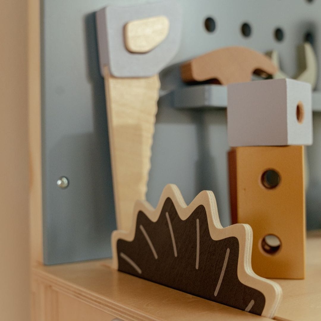 Set uključuje alat i dodatke, poput kružne pile, čekića i vijaka, te omogućava djetetu da se potpuno uživi u ulogu malog majstora. Površine su obrađene netoksičnim bojama na bazi vode, sigurne za djecu. Čvrsta konstrukcija od drveta i MDF-a garantuje stabilnost i dugotrajnost.
