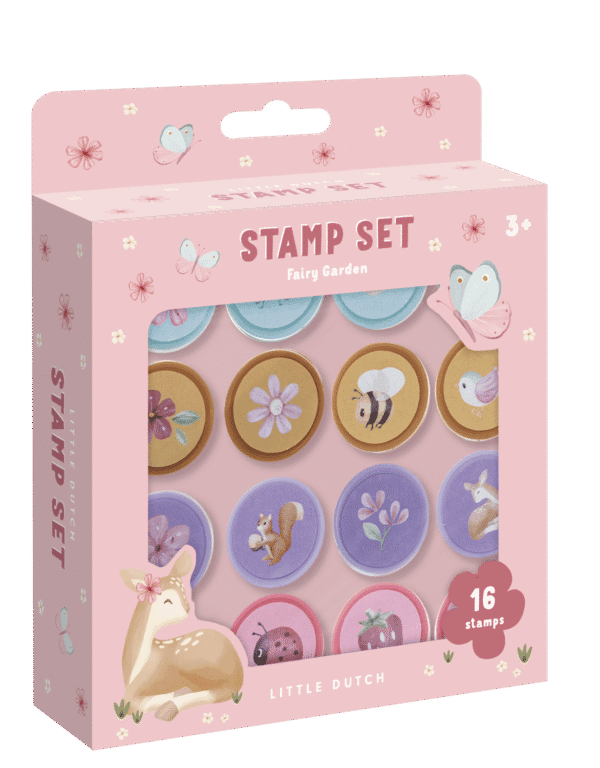 Set štambilja Fairy Garden sadrži 16 pečata koji imaju u poklopcu tintu.
