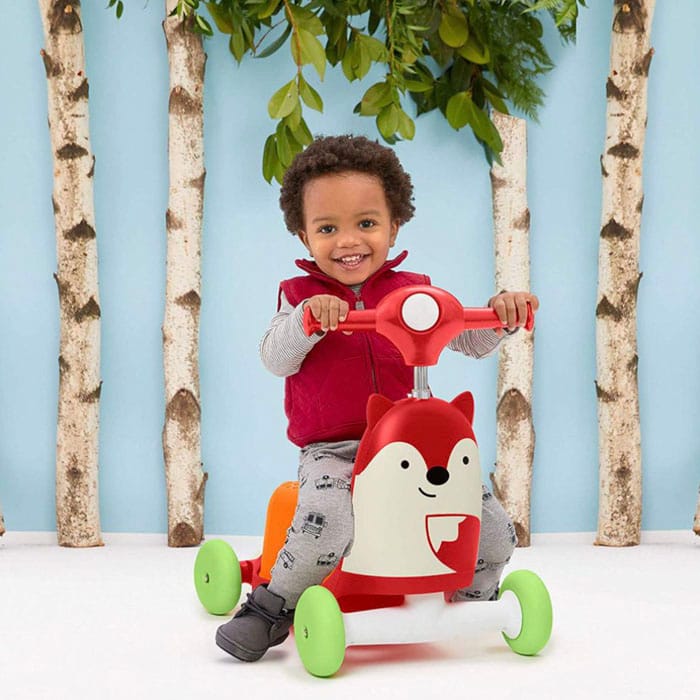 1. faza: hodanje / pomaže malim šetačima kada uče hodati i omogućava im da guraju i povlače omiljene igračke sa sobom. 2. faza: guralica se koristi sa sjedalom za vožnju i odlična je za djecu koja uče kretanje odgurivanjem od pod. 3. faza: Kako mališani rastu, lako se pretvaraja u skuter