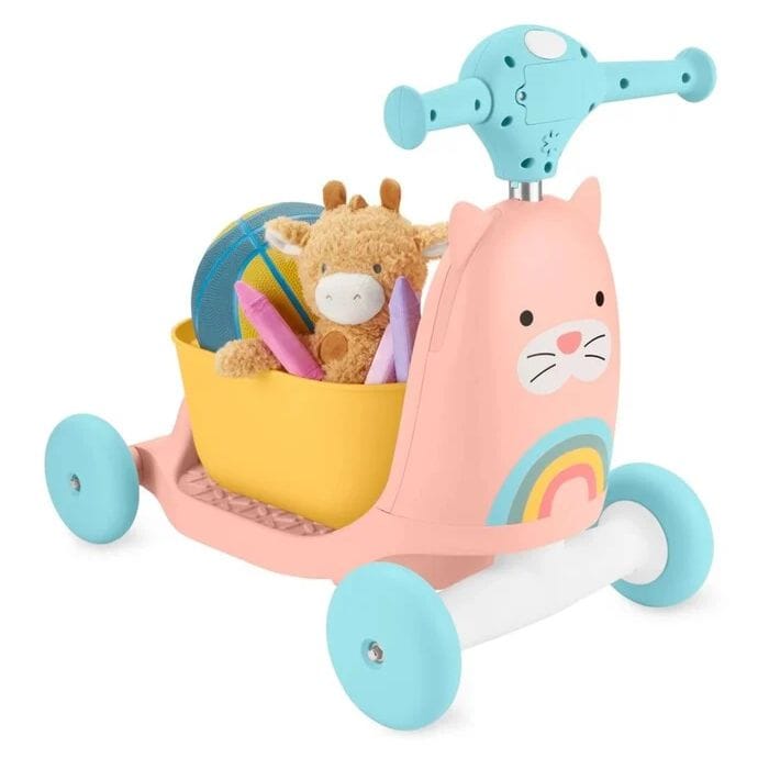 1. faza: hodanje / pomaže malim šetačima kada uče hodati i omogućava im da guraju i povlače omiljene igračke sa sobom. 2. faza: guralica se koristi sa sjedalom za vožnju i odlična je za djecu koja uče kretanje odgurivanjem od pod. 3. faza: Kako mališani rastu, lako se pretvaraja u skuter